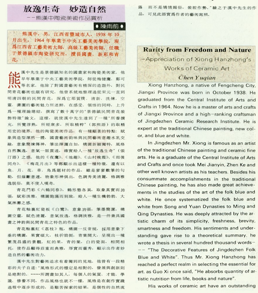 熊汉中先生是景德镇知名的国画家和陶瓷美术家。他早年毕业于中央工艺美术学院,师从梅健鹰、郑可等名家。他除了对国画艺术有精深的造诣外,对民间青花艺术也颇有研究。他曾系统地整理过从宋元一直到明清四朝的民间青花,深为它那质朴、清新、洗炼、空灵,潇洒的艺术魅力所迷醉。在感受、领悟的同时,上升为一种理论总结,撰写了数十万字的“景德镇民间青花装饰特徵”论文。这样,就使漠中先生达到了一种“所养扩充,所览淳熟,所经众多,所取精粹。(郭熙语)的取精用宏的境界。他的陶瓷美术作品,有一种显著的特点:赋象舆造型浑然一体,国画艺术韵味与民间艺术意趣水乳交融,意象简炼传神,笔法挥洒自如,构图新颖独特,风格自然飘逸,意气一脉贯通,确实给人一种“放逸生奇”(张汀语)之感。他的《夜鹰》、《池趣》、《山村晚霞》、《雨後同舟》。 《梅花月出》等都显示出这样一种特徼。还有以鱼、月、花、草、鸟为题材的作品,虽是寥寥敷笔的勾勒,但线断意连,物象形神俱出,色调秀美清丽,格绸雅逸脱俗,莫不使人叹奇,