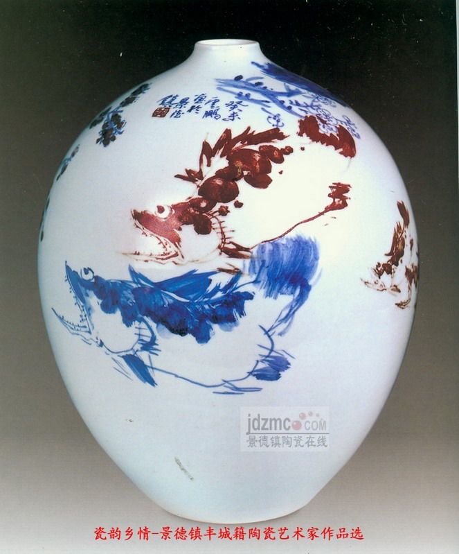 景德镇丰城籍艺术家 青花釉里红《梅花鳜鱼》瓶 作者:黄云鹏