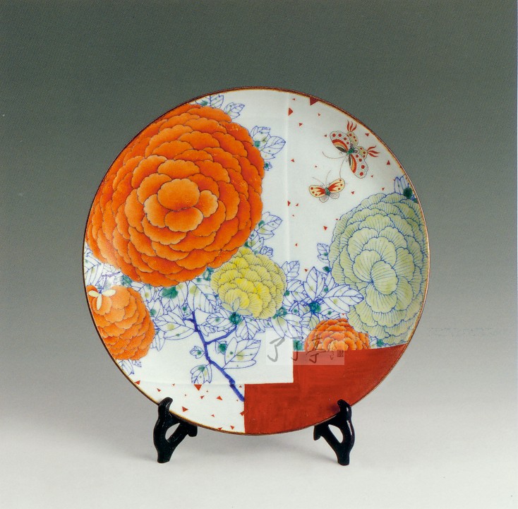 该作品以牡丹花“花开富贵”和圆盘“团团圆圆”的象征含义,寓意“富贵团圆”。在表现手法上采用青花斗彩加现代构成相结合的方法,以青花勾线,成瓷以后以古彩团花的手法彩绘牡丹花。两只古彩装饰的蝴蝶,增加了画面的生动性。牡丹花叶采用白描的手法,点上散落的绿色点,使其既有传统意味,更具现代感;
