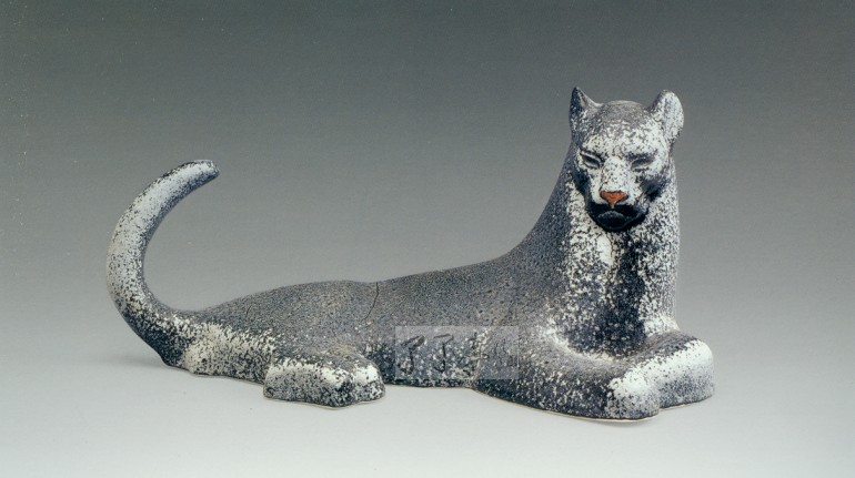 泥与火的艺术是天人合一的艺术,是人工加自然的艺术一次偶然的停电,却产生了意想下到的特殊效果,雪豹,就是这样产生的.本要烧1300摄氏度的高温,却在1100℃停电,原以为完蛋了,可开窑门一看,眼前却是一特殊效果,从此得出结沦:釉色完整光亮-不是唯一的效果,不光亮且有着殁缺肌埋的纹样更觉耐看;以后便有意的追求更多的残缺肌理效果。这是作者的得意之作;作品产生残缺.灰白的裂纹纹理的特殊效果,很象雪豹,因而得名;作品造型简洁,头颈竖起与翘起的尾巴形政“u”字形,前后呼应.其形象凶掹而又敏捷,它似乎在注视看什么,一旦有猎物出现,瞬间就会锰扑过去.