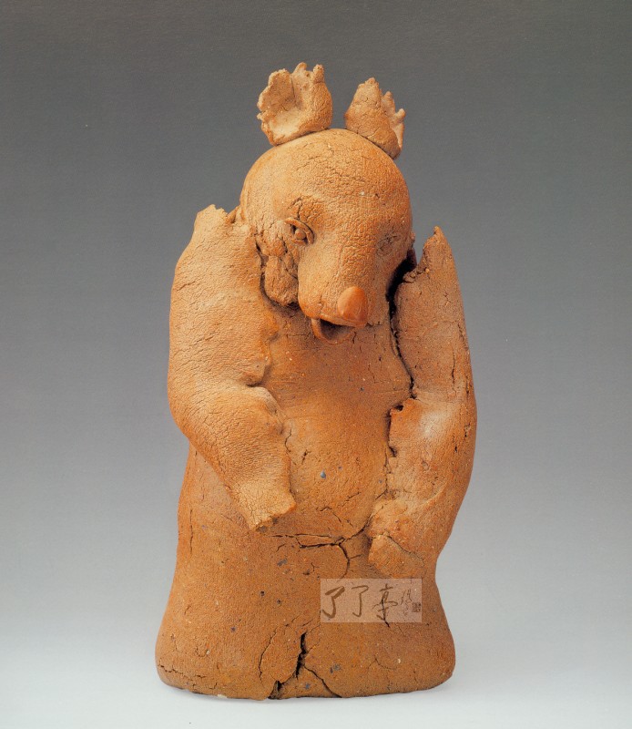 拘熊憨厚,笨拙、肥大,行动莽撞,但经常会出现一些滑稽可笑的人性化动作:本作品表现熊在摸摸自己的肚皮后发现有”喜”后的惊喜神情-是人性化和趣味化的表现,棕熊的毛色是咖啡色,用瓷土加紫砂泥是恰当的:用泥板成型的方法更觉轻松自由,毫无人工造作之感.这种表现就是原作陶艺的典型语言.