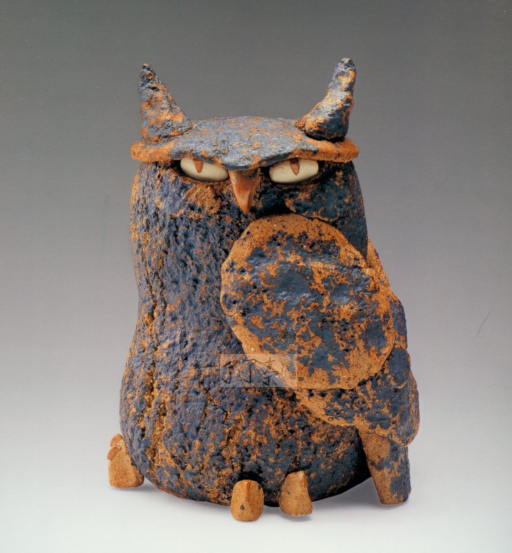 作品用耐火材料—闸钵土打成泥板后用粹铁末摸上后卷简成型-铁质融化后产生斑斑驳驳特殊的装饰效果。这件作品追求原始韵味,自然天成,是泥板成型的现代陶艺的优秀作品,粗犷而又大气,用白瓷表现眼睛,与耐火泥的身子形成强烈的对比,更显炯炯有神,