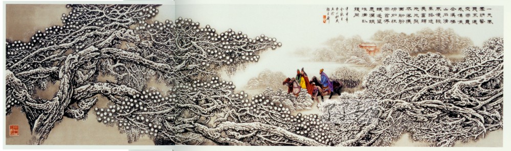 粉彩《三顾茅庐》瓷板画,画面气势恢宏,构图严谨,情景交融,意境深邃,内容和形式达到了完美统一,具有很 ‘