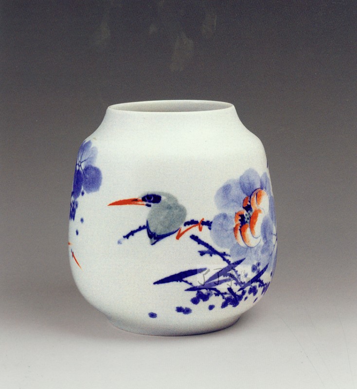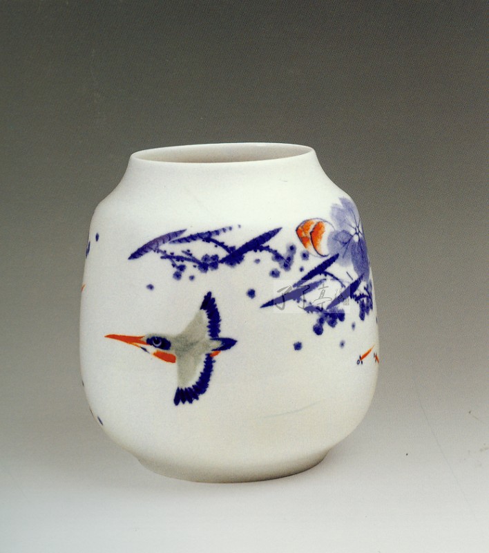 熊汉中荷塘翠鸟2005年高/25.5cm 腹径/23.5cm 作品采用写意的手法,充分发挥青花色料散晕多变的性能,使之浓淡枯湿,层次丰富,获得水墨画一样的美感。作品中使用了少许的釉下红彩,如鸟嘴,荷花以及水中的游鱼,色彩对比强烈,使作品呈现清新之气。