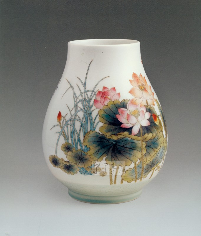 徐亚凤荷塘清香福筒瓶2002年6月高/33cm 腹径/2了cm作品表现的是夏天池塘中荷花盛开的美景:亭亭乇立的荷花姿态各异,正侧向背的荷叶疏密有致:含苞待放的花蕾,才露尖角的小荷,穿插自然,优美动人。整幅画面构图新颖,造型秀丽,线条工整细腻,色彩浓而不绝,格调典雅清丽。