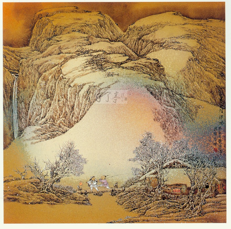 饶晓晴、徐硕 中国工艺美术馆邀请展作品:《寒山村祥瑞》2005年长/50Cm 宽/50Cm该作主要以色釉的自然肌理来突出创作主题,非常精妙地表现出传统中国山水画的空灵之境。画中崇山巨壑作全景式构图,远景主峰肃穆,气势宏伟,近景古树苍郁,深谷中山泉激荡,飞瀑直下。木桥上两个孩童执灯戏行,似乎逍遥于世外桃源。作者巧妙地根据色釉的肌理,将瓷与画的主题结合起来,有浑然天成之感。