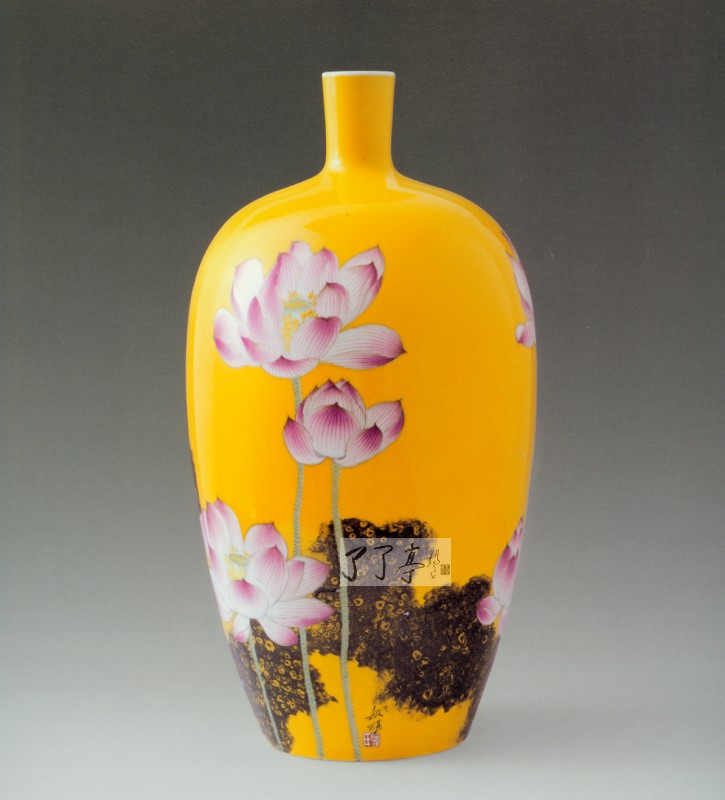 范敏祺 中国美术馆陶瓷艺术邀请展作品:“十里飘香”2004年高/60cm 腹径/31cm 作品采用传统粉彩重工工艺、刻花工艺与现代装饰相结合的手法。用写实手法表现荷花,以泼墨手法表现荷叶,使具象与抽象表现手法相得益彰。在色彩上,淡紫色的荷花和墨色的荷叶与黄色的主色调对比鲜明,突出了彩瓷工艺的艺术效果。