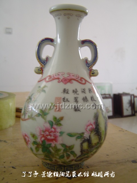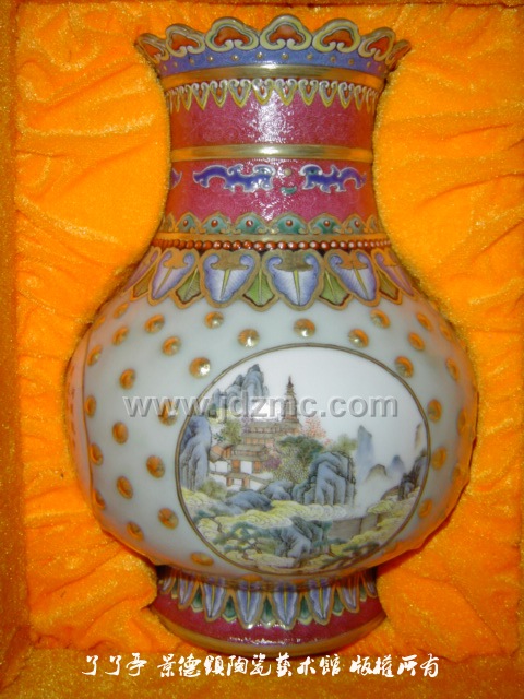 1998年作品仿珐琅彩,豆青地开光山水诗句瓶和粉彩花鸟,获中国工艺美术百花银杯奖,并获该奖项优秀新产品一等奖。