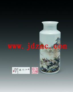 | 说明 | 张志汤 粉彩“秋山行旅”瓶 创作年份 1944 高22厘米 题识:秋山行旅。甲申冬月星江,张志汤写意。 印识:张志汤、大陶斋 作品赏析 兹粉彩“秋山行旅”瓶,布置有序,理路清晰,赋色淡冶,动静相宜。景中远山连绵,云气弥漫,烟波涵淡,草木勃郁,一行路人,忙於赶路,骑马挑担,风尘仆仆,偶见一骑马者回首凝望,似沉湎於眼前美景,而不舍离去。味览之,旷达逸气,直侵心扉,甚觉意蕴超妙。 Zhang Zhitang A famille-rose ‘Landscape’ vase 1944 H.22cm Appreciation: A lovely landscape is painted on to this elegant vase. Elements of water, trees and mountains dominate. RMB: 30,000-40,000 作者简介 张志汤(1893-1971),画室名“亦陶斋”,江西婺源人。1901年入景德镇余立卿红店学艺,1935年任浮梁陶瓷职业学校教师,1945年在江西省立陶专工作。解放后在景德镇陶瓷学校任教,1959年由景德镇市政府授予“陶瓷美术家”称号。 |