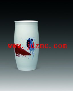 | 说明 | 傅尧笙 青花釉里红“双鹭”瓶 腹径20厘米 高39厘米 作品赏析 青花釉里红者,渊雅奥邃,博大精深,皆时人所欲得,然企求鲜活不褪者,甚为难矣。兹器平朴真淳,简古淡泊,方寸乾坤,有容乃大。釉汁莹洁匀澈,圣洁斐然。腹身简笔施绘,以青花描摹双鹭,亭亭独立,安倚碧水,芦塘寂寂,静寥无声。诚可谓“发纤秾於简古,寄至味於澹泊”,立意超迈,殊可资玩。 Fu Yaosheng A copper-red and underglazed blue ‘Herons’ vase D.20cm H.39cm Appreciation: A pair of standing herons, painted in a vibrant blue glaze, look contemplatively onto red bulrushes. The vase is made in a modern design with no discernable lip and very straight sides. RMB: 80,000-120,000 |