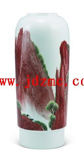 | 说明 | 徐子印 釉上彩“势拔千仞”瓶 高47厘米 作品赏析 徐子印掷笔不拘绳墨,不为程法羁缚,触类长之以穷其变者,一时多见巧思。所作妙不在山,韵不在景,而俱在笔墨肌理,满目纷繁,枯索苍劲,豪气俊逸,自得天趣,观之令人歆快不已。猛见之,大笔挥洒,墨韵纵淋,雄浑有力,气势贯达。然细碎处,草木蓊郁,屋宇相掩,精心收拾,布置得法,尤觉意蕴超妙、耐人寻味矣。 Xu Ziyin An overglaze enamel ‘Landscape’ vase H.47cm Appreciation: This elongated vase without a ring base has long brush strokes and liberal use of red wash glazing. Small, exquisitely painted trees and flora add a nice touch. RMB: 100,000-120,000 作者简介 徐子印(B.1940),江西馀干县人。江西省工艺美术大师,从事陶瓷美术现代山水画创作。其作品突出了陶瓷肌理和墨韵变化的艺术语汇,表现了现代艺术审美观和“中西融合”的视觉形象。 |