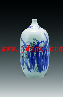 | 说明 | 辛青山 青花斗彩“水仙”瓶 腹径25厘米 高51厘米 附证书 作品赏析 兹瓶口小实乃容大,方寸间容得众香摇曳,舒笔作耕,澹墨轻和,凌波仙子,清雅绝尘,真赏心悦目矣。辛青山运笔俱宗画旨,线条若行云流水,转折不滞;气韵似娉婷曼舞,柔婉不纤。青花红彩,互为逗趣,落笔时妙然生花,转手间入木三分,兹神来之笔,岂容易可谈哉! Xin Qingshan A blue and white and doucai ‘Narcissus’ vase D.25cm H.51cm Appreciation: A simple artistic style here belies the elegance and grace of the vase’s form. Pale blues and greens set off the dark red of the flowers core. RMB: 80,000-100,000 作者简介 辛青山(1939-1993),江西临川人。师从胡献雅、馀翰青、聂杏生等,专攻陶瓷釉上彩绘、釉下青花装饰。生前在轻工业部陶瓷工业科学研究所,从事陶瓷美术创作,系高级工艺美术师、中国美术家协会江西分会会员、中国工艺美术学会会员、中国陶瓷工业协会陈设艺术陶瓷专业委员会副主任委员、景德镇市文联委员、景德镇市美协理事、景德镇陶瓷史研究学会理事。 |