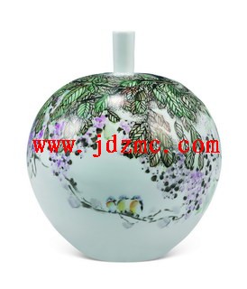 | 说明 | 张苏波 粉彩“枝上小鸟”瓶 高34厘米 作品赏析 兹瓶浑圆珠润,形制甚为殊特,球腹上以粉彩作绘“枝上小鸟”,上密下疏,犹若浓荫遮盖,不晓天穹碧色。白描枝叶俱生棱角,线条简括,稚拙无拘;硕硕垂玉淡若紫霞,参差错落,浑脱无间。叶缝间隙皆以中锋点笔,以示明暗阴晦之别,密密匝匝,奇象迭出。偶见一苍枝横穿而出,三只小鸟呢喃耳语、驻足枝上,顿觉趣意迸生。张苏波作画,不守其常,而穷其变者,点线面目夥颐,不板不滞,气象万千,邈不可一言以赅。 Zhang Subo A famille-rose ‘Bird’ vase H.34cm Appreciation: Three small birds are almost overwhelmed by the overhanging leaves in this charming work. A curious long and thin neck is an interesting aspect of this piece. RMB: 50,000-70,000 作者简介 张苏波(B.1964),江西玉山人。毕业於景德镇陶瓷学院美术系设计专业,获学士学位。现供职於景德镇高等专科学校艺术系,教授。系中国工艺美术学会会员、高岭陶艺学会理事、景德镇市十一届政协委员。陶艺作品频繁入选国际和国内各种展览。 |