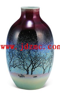 | 说明 | 白 海 色釉装饰“冬之韵”瓶 高39厘米 作品赏析 此件作品具有一种别样的审美情趣,其运用了不同於传统的绘画创作理念,将西方绘画中的图式元素引入到造形中,又以明丽的暖色调来烘托艺术气氛,表达出了一种温煦柔和的视觉效果。画面描绘了冬日漫天飞雪的茫茫境象,鹅绒般的皓雪无声无息地飘落,而这片孕育生灵的大地,则似乎在向我们细细叙说着这段浓浓的乡情。几只觅食闲步的野鹿,则更为作品平添了勃勃的生机与活力。 Bai Hai A colour-glazed ‘Winter Scene’ vase H.39cm Appreciation: Deep red glaze at the neck of the vase gives way to midnight blues and on to lighter hues and white flecked snow glazing. Simple but powerful are the small groups of deer around the base of this tall vase. RMB: 80,000-120,000 作者简介 白海(B.1945),江西临川人。擅长国画、陶瓷山水、人物装饰。 曾在景德镇陶瓷职工大学美术系任高级工艺美术师,教学十餘载。现任绍兴文理学院艺术系主任、副教授。 |