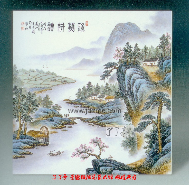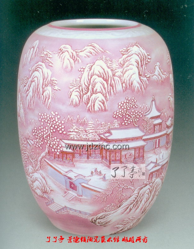 渔樵耕读·粉彩瓷板楼台雪霁图·粉彩瓷瓶