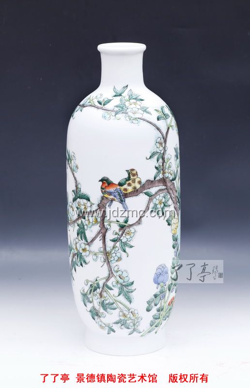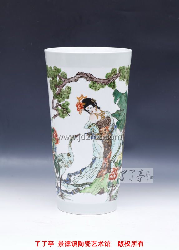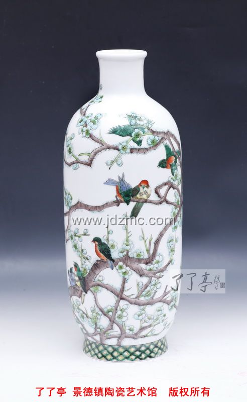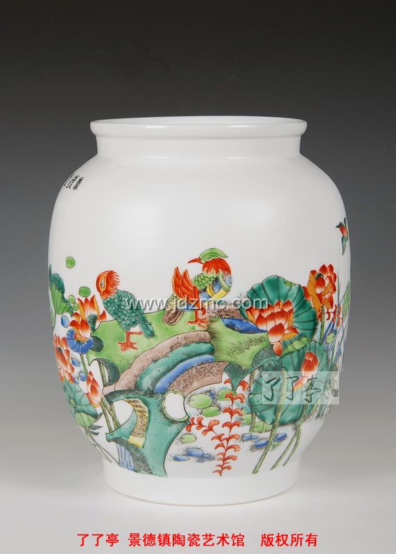求变和创新是陶瓷艺术发展的必然客观规律,品读程幸古彩作品,可见新风新意之处表现有三,其一,地均留白,器皿通体白釉,让大红大绿中添加了些许淡雅靓丽。传统古彩“美在大红大绿”,然确实显古板俗气,难以迎合现代审美眼光。更难能可贵的是,程幸在创作过程中实践探索及反复研制,除了深谙古彩颜色的光暗深浅规律外,在五彩基础上已经创造出更多适合现代审美的古彩颜色,丰富了古彩的色彩范围。其二,让创作题材由呆板装饰图案渐向“采菊东篱下,悠然见南山”的意境山水,增加了其浪漫主义色彩。其三,构图理念上采用虚实结合的手法,让传统古彩版画式“实”构图“活”起来,既不失传统之精髓,又具时尚风格。不拘泥于装饰和客观物体再现,画面多了几分灵动和风韵。