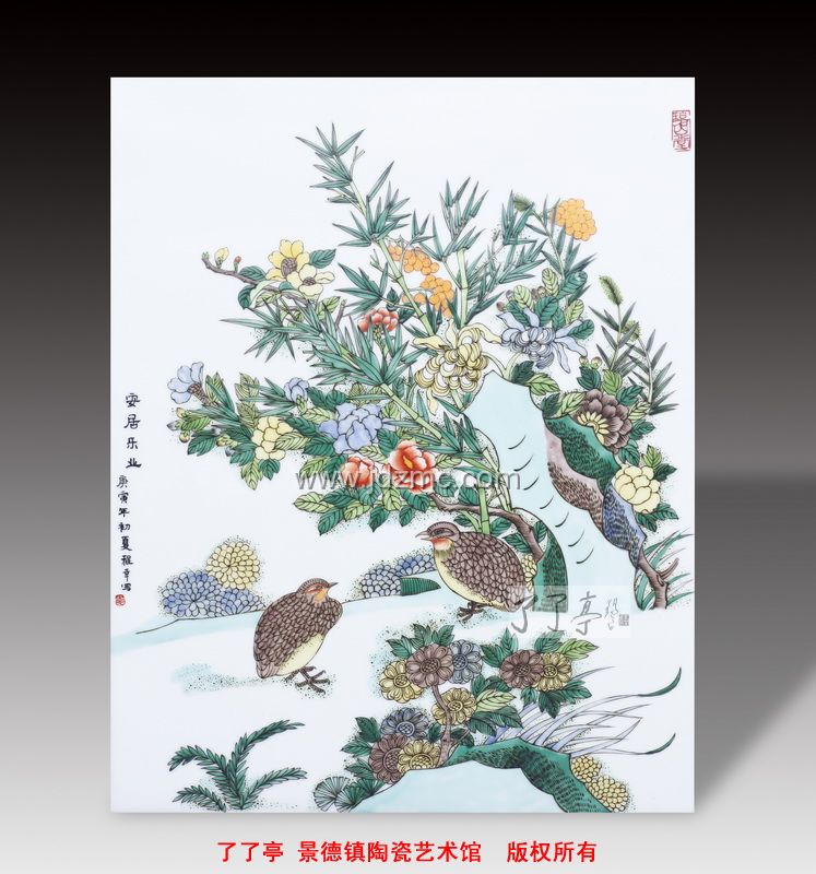 获得国家百花奖的作品《甜蜜》为其早期传统花鸟画,构图上疏朗有致,画中树干采用“排线”笔法表现,齐而不板,齐而不齐,既表现了物体结构特点,又表现出阳阴明暗变化,加强了装饰风。牡丹形态各异,或是含苞欲绽,或是盛开怒放。又见鸳鸯游戏其中,以水波衬托。画面动中有静,静中有动,秀美灵动,抛弃了传统古彩刻板的画面形式。五色竞妍、富丽堂皇的琉璃质材料在如玉般瓷盘中互映生辉,色彩明净晶莹,更显装饰美和意蕴美。令此处的大红大绿“妙于古色古香”,达到大俗大雅之绝妙境界。大片留白处题字,打破了古彩“满”“实”的构图惯例,透露出中国画的意蕴,高雅清新,主题亦得到突出。与圆形瓷盘的材质美相得益彰,共同形成富丽美满、和谐喜庆的主题。《乐在其中》婴戏图中,构图以童子为中心,配以仙草灵芝、寿桃、牡丹类吉庆题材。画面内容平衡饱满,整体形式感已与新彩相结合。古彩鲜明的对比烘托出吉庆的气氛,两个衣着鲜亮的童子手捧桃篮行于生机盎然的丛中,红色腰带点缀着绿色的衣裳,纹饰繁而不乱,红扑扑的面儿洋溢着天真烂漫,稚趣可爱。童子抬脚之间的细节表现已让活泼和欢快气氛表达的淋漓尽致。方寸之间,画者用沉郁暗香的古彩色彩描绘浓郁的童趣,古朴中就又添了一份热闹。其中的感情色彩与观者记忆产生共鸣,令其观者欣然,画者达意——对于画者,也许是“夕阳之下忆童蒙,会心一乐自从容”的又一番心境。