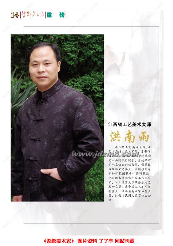 江西省工艺美术大师 洪南雨:江西省工艺美术大师,江西省高级工艺美术师,本科学历,获学士学位。现任景德镇陶瓷书画院执行院长,景德镇市美术家协会副秘书长,景德镇市政协文史委员,景德镇高等专科学校国教中心特聘教授,中国国家画院张志民工作室画家,对外经贸大学汉语基地艺术研究员。系中国工艺美术学会会员,江西省美术家协会会员,江西省民间文艺家协会会员。