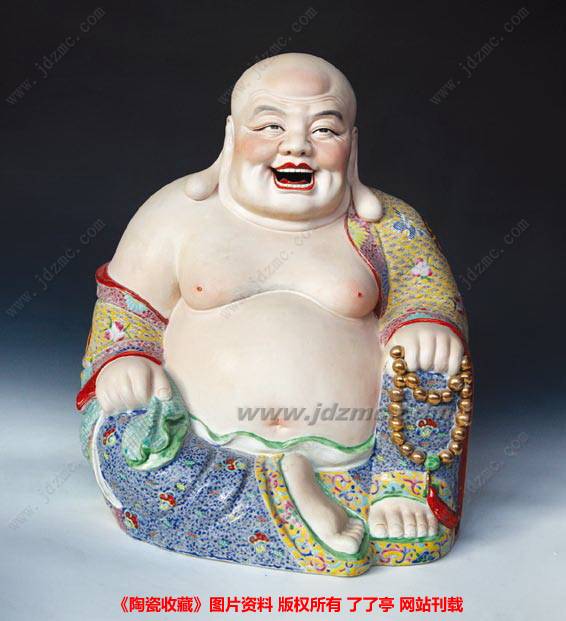 弥勒佛作坐姿,袒胸露腹,手拿念珠,收腿赤足,双耳垂肩,慈眉善目。衣饰似行云流水,真实自然。衣服纹理描绘得精巧无比,素淡雅气。人物染彩真实细腻,神韵毕现。