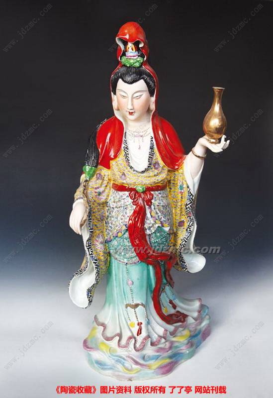中国化的观音,历来被塑造成大慈大悲、法力无边、救苦救难、普渡众生的观世音菩萨,被视为真善美的理想化身,受到广泛的喜爱和供奉。瓷塑另一个艺术特色是衣纹处理深得中国工笔画以线造型的神韵,人物的手足、珠串、花饰、缨络,都是手工捏塑而成,其精巧纤秀,工艺逼真,造型生动,形象传神, 精雕巧塑, 风格独特。此件产品具有极高的艺术价值和观赏价值,是居家陈列、馈赠收藏、佳节贺礼的绝佳选择。产品也适用于开光、室内装饰和大型场所摆设。
