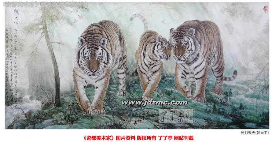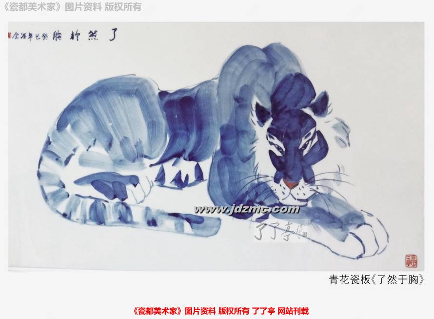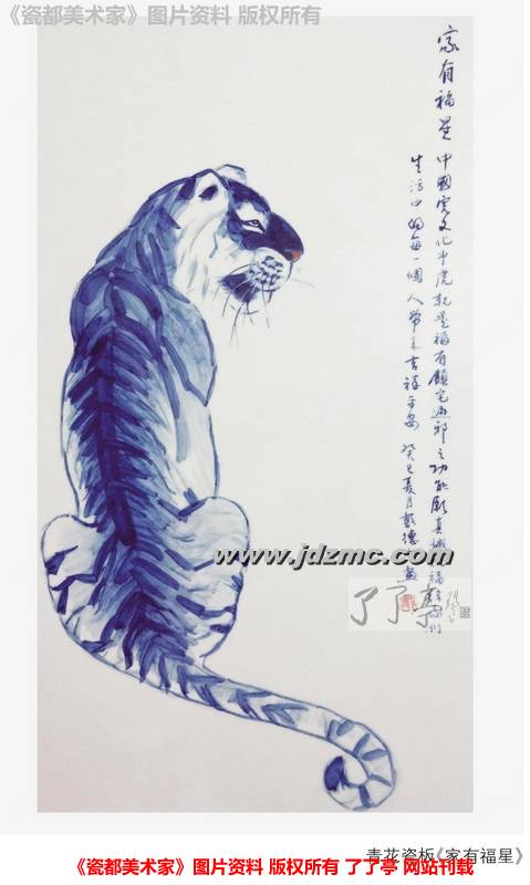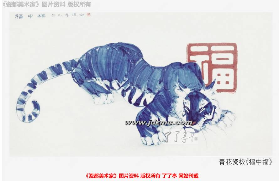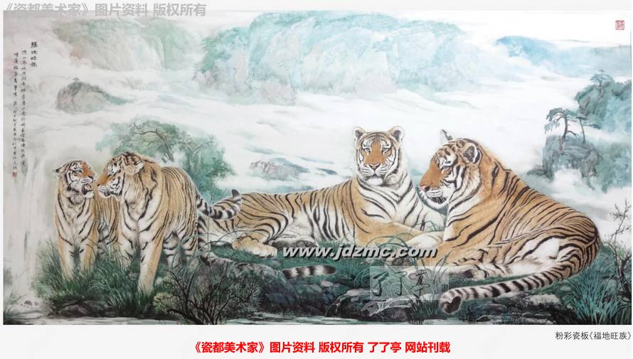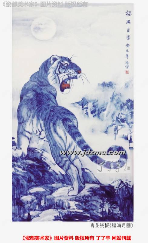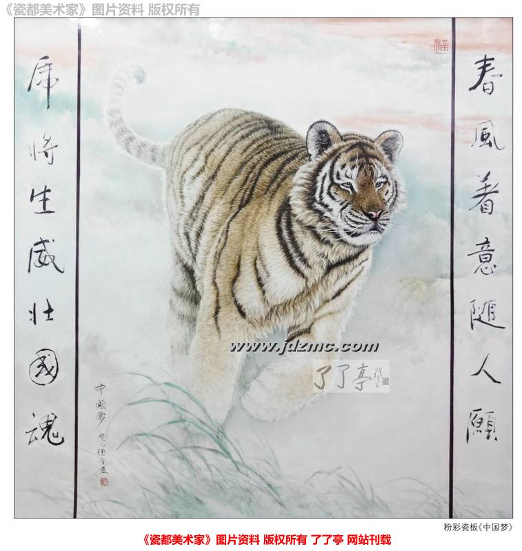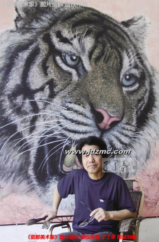 戴德全,1955 年生于东北辽宁,毕业于鲁迅美术学院,2002 年来景德镇从事陶瓷文化虎文化的研究、创作。2009 年瓷板画《风雪人生路—泰山峰上》荣获景德镇市首届民间文艺家协会美术陶瓷大奖赛金奖;2010 年作品《法眼天下》荣获江西省首届国际鄱阳湖生态艺术文化节金奖;2012 年作品《今日说法》荣获第二届东北亚工艺美术精品博览会银奖;曾于2010 年10 月在景德镇市仲安画廊成功举办《虎年福星·戴德全陶瓷艺术作品全国巡回展》。同年,由江西美术出版社出版《景德镇当代陶瓷名家作品丛书》个人画虎专辑,中央电视台《盛世收藏》、景德镇电视台《陶瓷视界》、广东电视台《古韵今谈》先后报道其人其作。近年《中国收藏》杂志收录其画作《春风又绿龙泉源》。