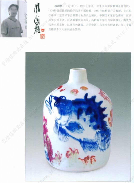 周国桢 1931年生。1954年毕业于中央美术学院雕塑系并留校,1976年调景德镇陶瓷学院美术系任教,1987年破格提升为教授。先后担任中国工艺美术学会雕塑专业委员会顾问,中国美术家协会理事,江西省美协副主席,江西雕塑学会会长,高岭陶艺学会首届理事长,陶瓷学院美术系主任,江西高教评委,首届中国工艺美术大师评委,九、十届景德镇市人大兼职副主任等