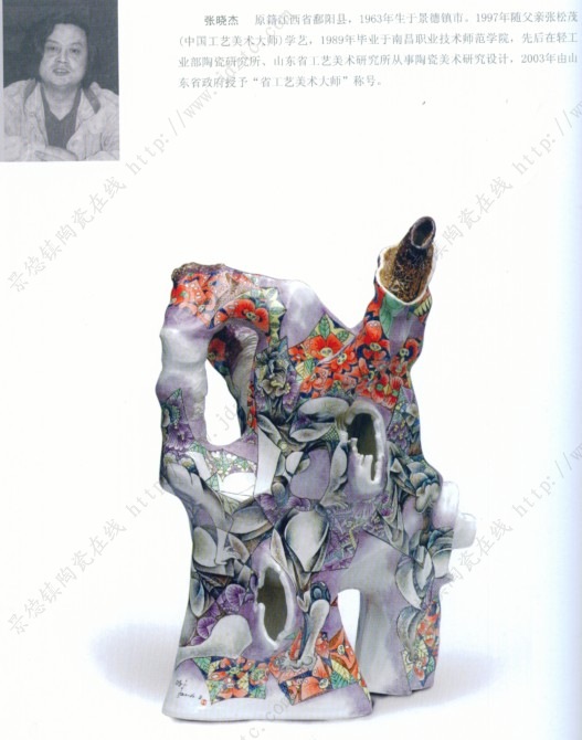 张晓杰 原籍江西省鄱阳县,1963年生于景德镇市。1997年随父亲张松茂(中国工艺美术大师)学艺,1989年毕业于南昌职业技术师范学院,先后在轻工业部陶瓷研究所、山东省工艺美术研究所从事陶瓷美术研究设计,2003年由山东省政府授予“省工艺美术大师”称号。