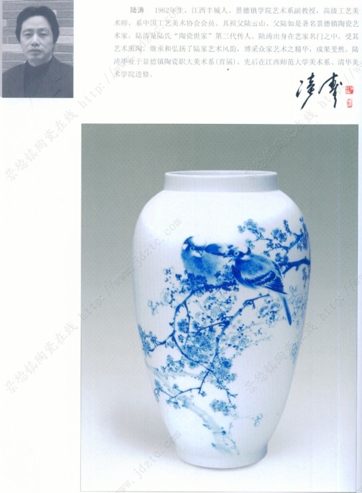 陆涛 1962年生,江西丰城人。景德镇学院艺术系副教授,高级工艺美术师,系中国工艺美术协会会员。其祖父陆云山、父陆如是著名景德镇陶瓷艺术家,陆涛是陆氏“陶瓷世家”第三代传人。陆涛出身在艺家名门之中,受其艺术熏陶,继承和弘扬了陆家艺术风韵,博采众家艺术之精华,成果斐然。陆涛毕业于景德镇陶瓷职大美术系(首届)、先后在江西师范大学美术系、清华美术学院进修。