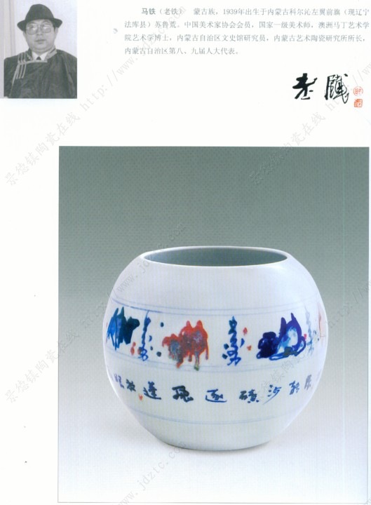 马铁(老铁) 蒙古族,1939年出生于内蒙古科尔沁左翼前旗(现辽宁法库县)苏鲁荒。中国美术家协会会员,国家一级美术师,澳洲马丁艺术学院艺术学博士,内蒙古自治区文史馆研究员,内蒙古艺术陶瓷研究所所长,内蒙古自治区第八、九届人大代表。