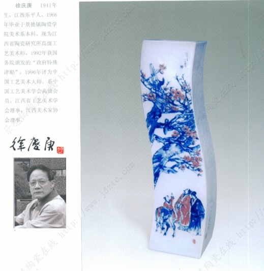 徐庆庚 1941年生江西乐平人。1966年毕业于景德镇陶瓷学院美术系本科。现为江西省陶瓷研究所高级工艺美术师,1992年获国务院颁发的“政府特殊津贴”,1996年评为中国工艺美术大师。系中国工艺美术学会高级会员,江西省工艺美术学会理事,江西美术家协会理事。