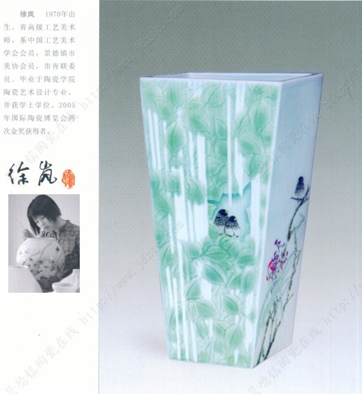 徐岚 1970年出生。省高级工艺美术师,系中国工艺美术学会会员,景德镇市美协会员,市青联委员。毕业于陶瓷学院陶瓷艺术设计专业,并获学士学位。2005年国际陶瓷博览会两次金奖获得者。