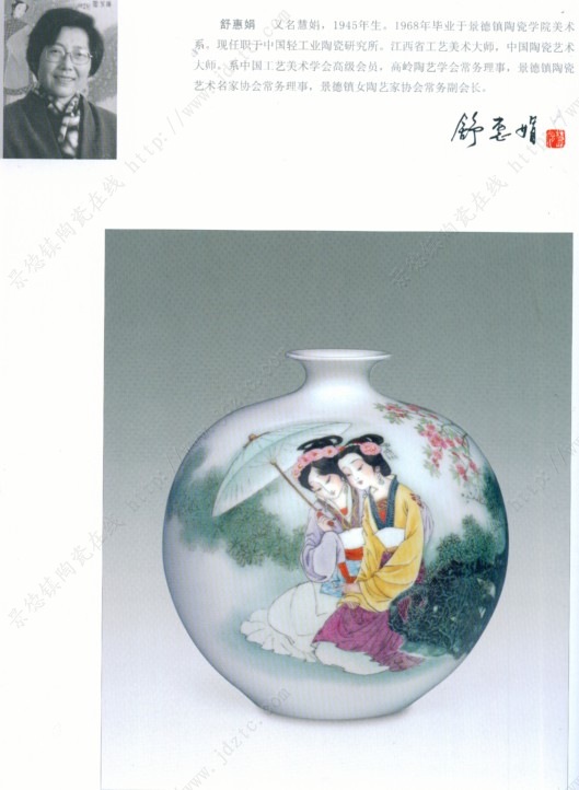 舒惠娟 又名慧娟,1945年生。1968年毕业于景德镇陶瓷学院美术系。现任职于中国轻工业陶瓷研究所。江西省工艺美术大师,中国陶瓷艺术大师。系中国工艺美术学会高级会员,高岭陶艺学会常务理事,景德镇陶瓷艺术名家协会常务理事,景德镇女陶艺家协会常务副会长。