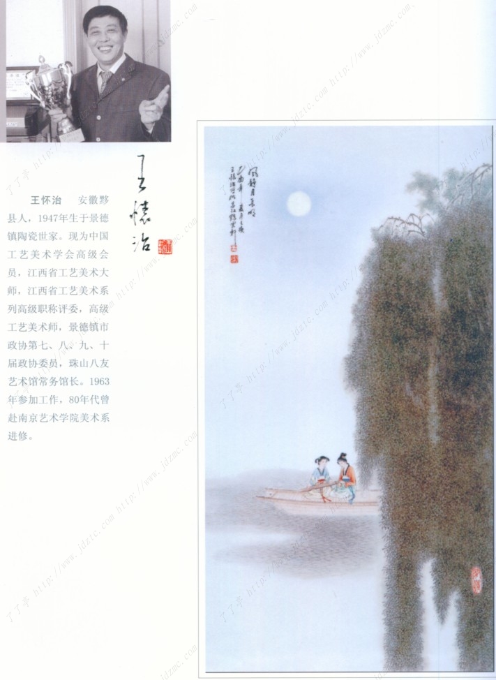 王怀治 安徽黟县人,1947年生于景德镇陶瓷世家。现为中国工艺美术学会高级会员,江西省工艺美术大师,江西省工艺美术系列高级职称评委,高级工艺美术师,景德镇市政协第七、八、九、十届政协委员,珠山八友艺术馆常务馆长。1963年参加工作,80年代曾赴南京艺术学院美术系进修。