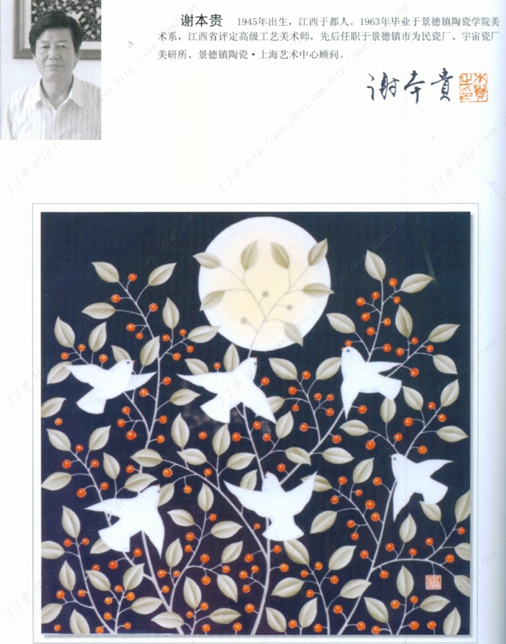 谢本贵 1945年出生,江西于都人。1963年毕业于景德镇陶瓷学院美术系,江西省评定高级工艺美术师,先后任职于景德镇市为民瓷厂、宇宙瓷厂美研所、景德镇陶瓷·上海艺术中心顾问。
