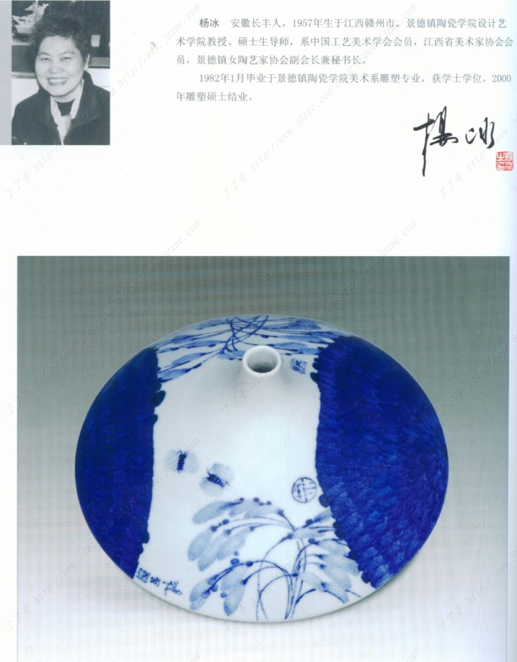 杨冰 安徽长丰人,1957年生于江西赣州市。景德镇陶瓷学院设计艺术学院教授、硕士生导师,系中国工艺美术学会会员,江西省美术家协会会员,景德镇女陶艺家协会副会长兼秘书长。