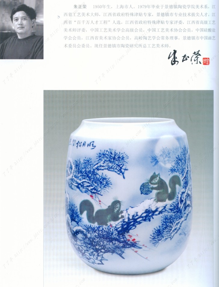 朱正荣 1950年生,上海市人。1979年毕业于景德镇陶瓷学院美术系,江、。西省工艺美术大师,江西省政府特殊津贴专家,景德镇市专业技术拔尖人才,江西省“百千万人才工程”人选,江西省政府特殊津贴专家评委,江西省高级工艺美术师评委,中国工艺美术学会高级会员,中国工艺美术协会会员,中国硅酸盐学会会员,江西省美术家协会会员,高岭陶艺学会常务理事,景德镇市中国画艺术委员会委员。现任景德镇市陶瓷研究所总工艺美术师。