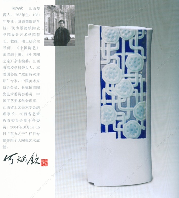 何炳钦 江西婺源人,1955年生。1981年毕业于景德镇陶瓷学院,现为景德镇陶瓷学院设计艺术学院院长、教授、硕士研究生导师, 《中国陶艺》杂志副主编, 《中国陶艺家》杂志编委,江西省高校学科带头人,享受国务院“政府特殊津贴”专家,中国美术家协会会员,景德镇市陶瓷艺术委员会委员,中国工艺美术学会理事,江西省工艺美术学会副理事长,江西省艺术教育委员会副主任委员,2004年10月14一15日“东方之子”栏目专题介绍个人陶瓷艺术成就。