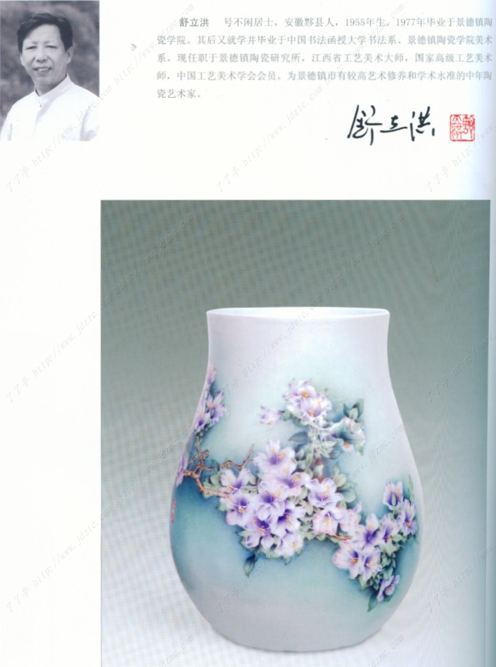 舒立洪 号不闲居士,安徽黟县人,1955年生。1977年毕业于景德镇陶瓷学院。其后又就学并毕业于中国书法函授大学书法系、景德镇陶瓷学院美术系。现任职于景德镇陶瓷研究所,江西省工艺美术大师,国家高级工艺美术师,中国工艺美术学会会员。为景德镇市有较高艺术修养和学术水准的中年陶瓷艺术家。