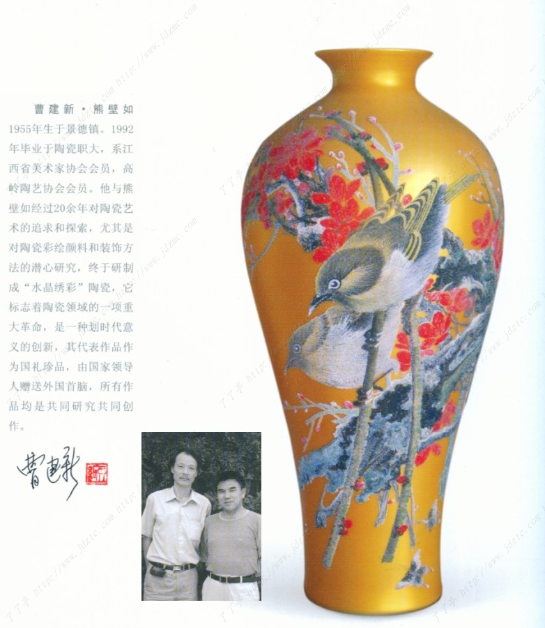 曹建新·熊壁如1955年生于景德镇。1992年毕业于陶瓷职大,系江西省美术家协会会员,高岭陶艺协会会员。他与熊壁如经过20余年对陶瓷艺术的追求和探索,尤其是对陶瓷彩绘颜料和装饰方法的潜心研究,终于研制成“水晶绣彩”陶瓷,它标志着陶瓷领域的一项重大革命,是一种划时代意义的创新,其代表作品作为国礼珍品,由国家领导人赠送外国首脑,所有作品均是共同研究共同创作。
