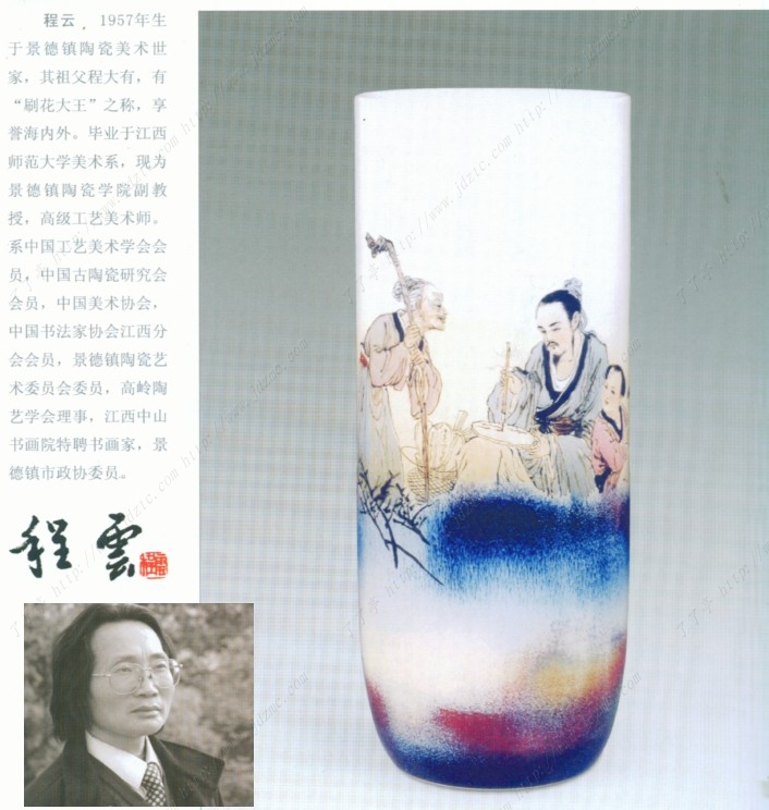 程云.1957年生于景德镇陶瓷美术世家,其祖父程大有,有“刷花大王”之称,享誉海内外。毕业于江西师范大学美术系,现为景德镇陶瓷学院副教授,高级工艺美术师。系中国工艺美术学会会员,中国古陶瓷研究会会员,中国美术协会,中国书法家协会江西分会会员,景德镇陶瓷艺术委员会委员,高岭陶艺学会理事,江西中山书画院特聘书画家,景德镇市政协委员。