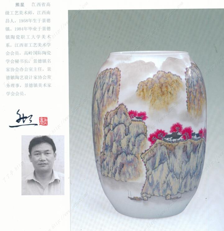 熊星 江西省高级工艺美术师,江西南昌人,1958年生于景德镇。1984年毕业于景德镇陶瓷职工大学美术系,江西省工艺美术学会会员,高岭国际陶瓷学会秘书长,景德镇名家协会办公室主任,景德镇陶艺设计家协会常务理事,景德镇美术家学会会员。