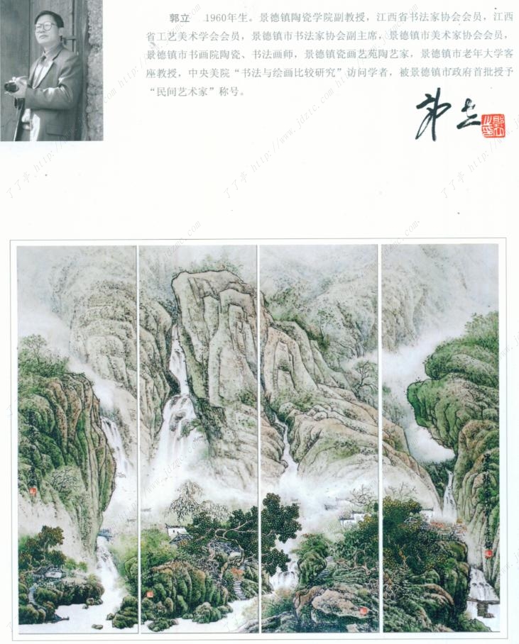 郭立 1960年生。景德镇陶瓷学院副教授,江西省书法家协会会员,江西省工艺美术学会会员,景德镇市书法家协会副主席,景德镇市美术家协会会员,景德镇市书画院陶瓷、书法画师,景德镇瓷画艺苑陶艺家,景德镇市老年大学客座教授,中央美院“书法与绘画比较研究”访问学者,被景德镇市政府首批授予“民间艺术家”称号。