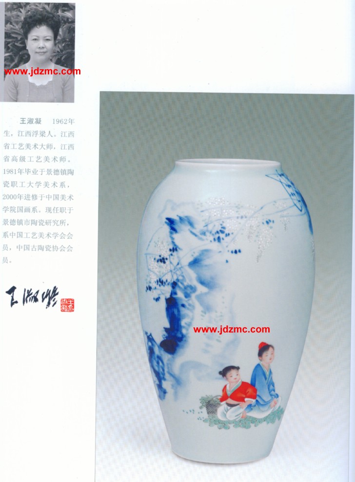 王淑凝 1962年生,江西浮梁人。江西省工艺美术大师,江西省高级工艺美术师。1981年毕业于景德镇陶瓷职工大学美术系,2000年进修于中国美术学院国画系。现任职于景德镇市陶瓷研究所,系中国工艺美术学会会员,中国古陶瓷协会会