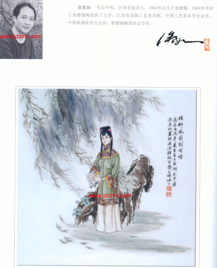 涂良如 号缶中客,江西省南昌人,1962年出生于景德镇。1984年毕业于景德镇陶瓷职工大学,江西省高级工艺美术师,中国工艺美术学会会员,中国鼻烟壶学会会员,景德镇陶瓷协会会员。