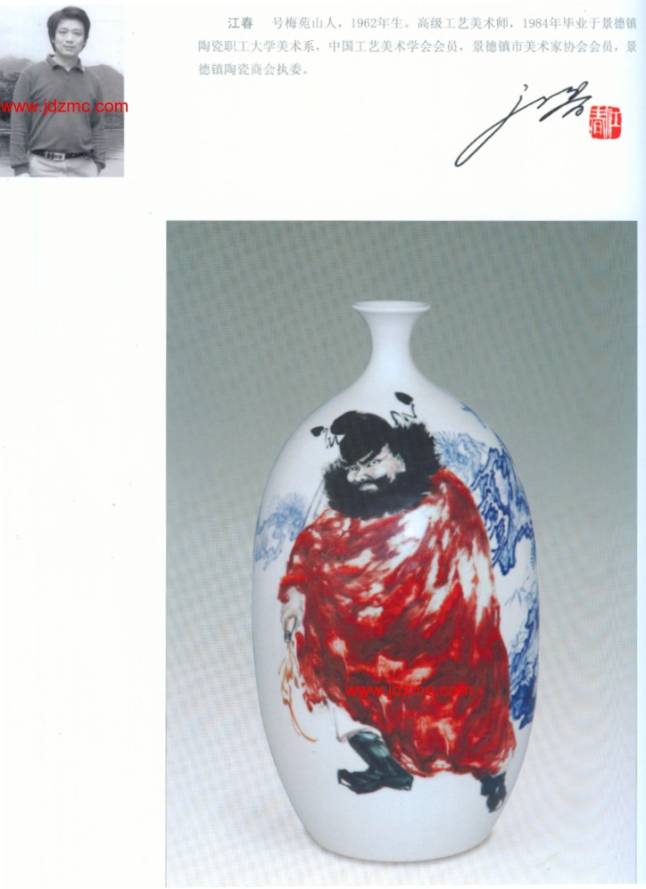 江春 号梅苑山人,1962年生。高级工艺美术师,1984年毕业于景德镇陶瓷职工大学美术系,中国工艺美术学会会员,景德镇市美术家协会会员,景德镇陶瓷商会执委。