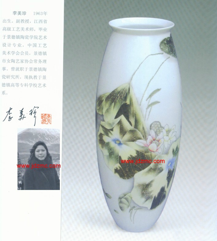 李美珍 1963年出生。副教授,江西省高级工艺美术师,毕业于景德镇陶瓷学院艺术设计专业,中国工艺美术学会会员,景德镇市女陶艺家协会常务理事。曾就职于景德镇陶瓷研究所,现执教于景德镇高等专科学校艺术系。