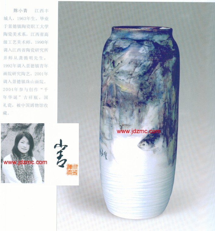 陈小青 江西丰城人,1963年生。毕业于景德镇陶瓷职工大学陶瓷美术系,江西省高级工艺美术师。1990年调入江西省陶瓷研究所并师从龚循明先生,1992年调入景德镇青年画院研究陶艺,2001年调入景德镇珠山画院。2004年参与创作“千年华诞”吉祥瓶、国礼瓷,被中国博物馆收藏。