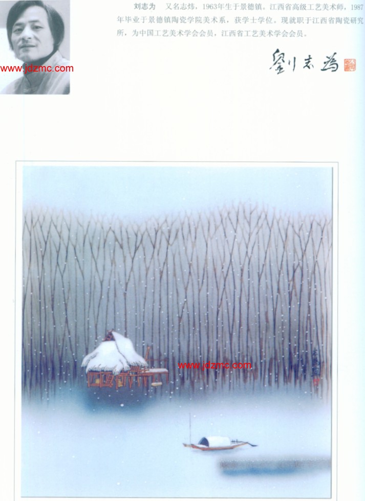 刘志为 又名志炜,1963年生于景德镇。江西省高级工艺美术师,1987年毕业于景德镇陶瓷学院美术系,获学士学位。现就职于江西省陶瓷研究所,为中国工艺美术学会会员,江西省工艺美术学会会员。