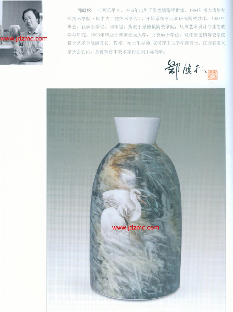 邹晓松 江西乐平人,1965年出生于景德镇陶瓷世家。1984年考入清华大学美术学院(原中央工艺美术学院),开始系统学习和研究陶瓷艺术。1988年毕业,获学士学位。同年起,执教于景德镇陶瓷学院,从事艺术设计专业的教学与研究。2006年毕业于韩国圆光大学,并获硕士学位。现任景德镇陶瓷学院设计艺术学院副院长、教授、硕士生导师,武汉理工大学在读博士,江西省美术家协会会员,景德镇青年美术家协会副主席等职。