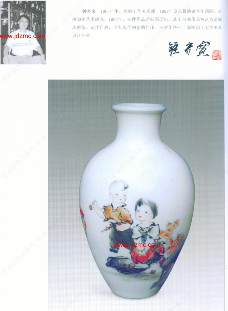 钟齐宝 1965年生。高级工艺美术师,1992年调入景德镇青年画院,从事陶瓷艺术研究,1993年,多件作品送韩国展出,其山水画作品被认为是师承傅统,造化自然,又有现代创意的佳作。1997年毕业于陶瓷职工大学美术设计专业。